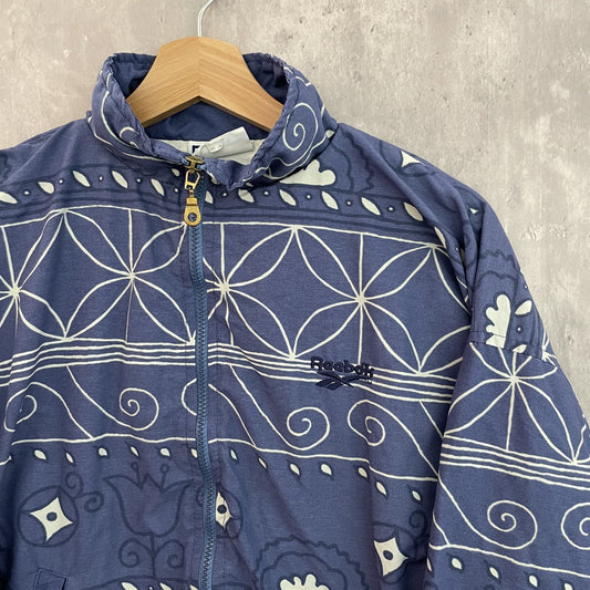90s vintage 古着 ビンテージ リーボック Reebok 総柄 ナイロン トラックジャケット ワンポイントロゴ刺繍 くすみブルー